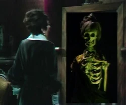 In the West Wing, Janet begins to lose her nerve. She continues to call out to the spirit, but gets no satisfaction. Suddenly, the antique cradle in the center of the room begins rocking. A telephone begins ringing and Findley goes over to answer it. The only thing coming over the line is the sound of breathing. She looks down and sees that the telephone cord has been ripped out of the wall. She hangs up the receiver, but the telephone just keeps ringing. She answers it a second time and the voice on the other end tells her that she is going to die. Frightened, she hangs up the phone. Pacing the room, she comes before a floor length mirror. The image in the mirror is not a reflection of Janet Findley, but rather a glowing skeleton.